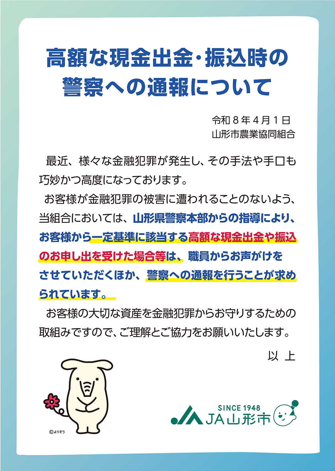 高額な現金出金・振込時の警察への通報について 4/1~